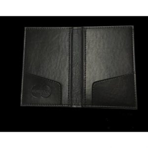 Adicionera confeccionada en cuero ecológico con tapa y dos solapas, una para la adición y otra para la tarjeta de crédito o débito.